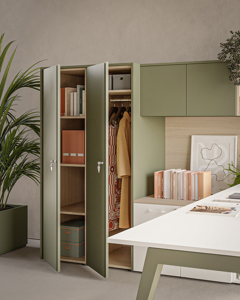 The Profbox system addresses this need directly. Its design features essential volumes, hinged doors, and extensive modularity, allowing for flexible configurations: wall-mounted, suspended, or freestanding center-room setups. Drawers, large baskets, open elements, and even planter boxes allow for customized compositions, balancing solids and voids. Furthermore, the variety of finishes allows the storage units to seamlessly integrate into the aesthetic identity of the space, enhancing order and functionality without sacrificing design.