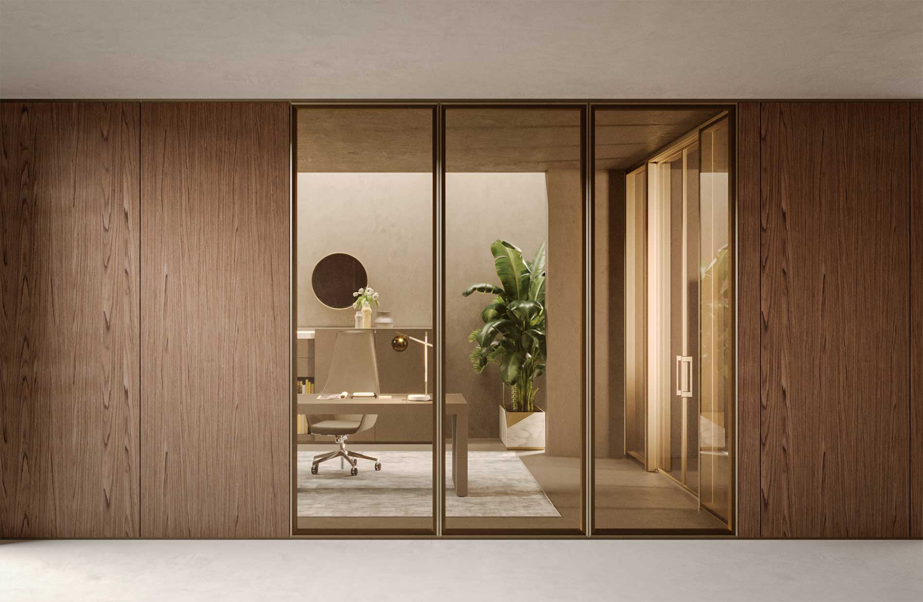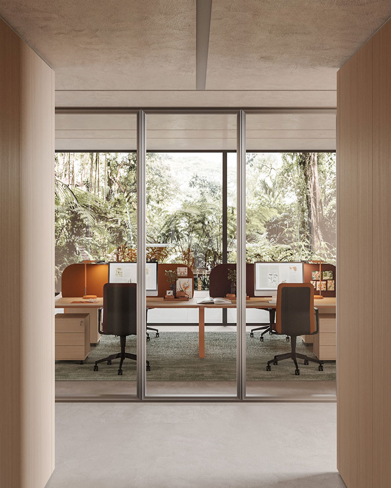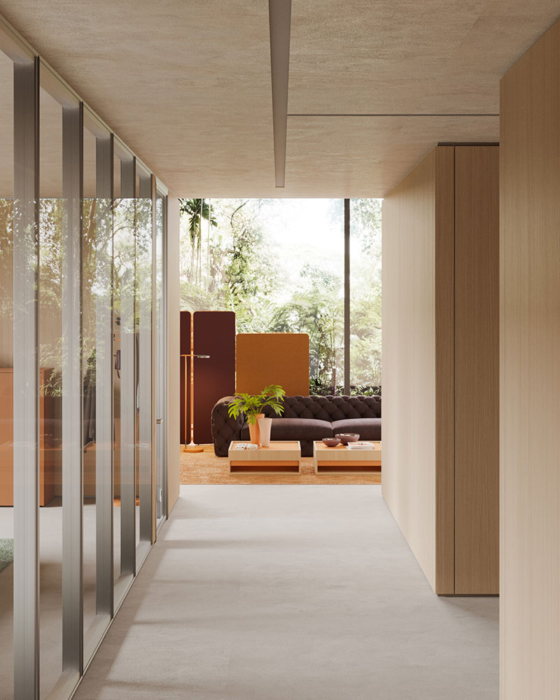 This solution provides the ability to modulate the space without structural changes, allowing for easy separation of operational areas from meeting rooms. Thanks to the use of glass and refined finishes such as wood or textured surfaces, Profwall transforms the need for privacy into a high-design element, maintaining the brightness and sense of spaciousness within the rooms.