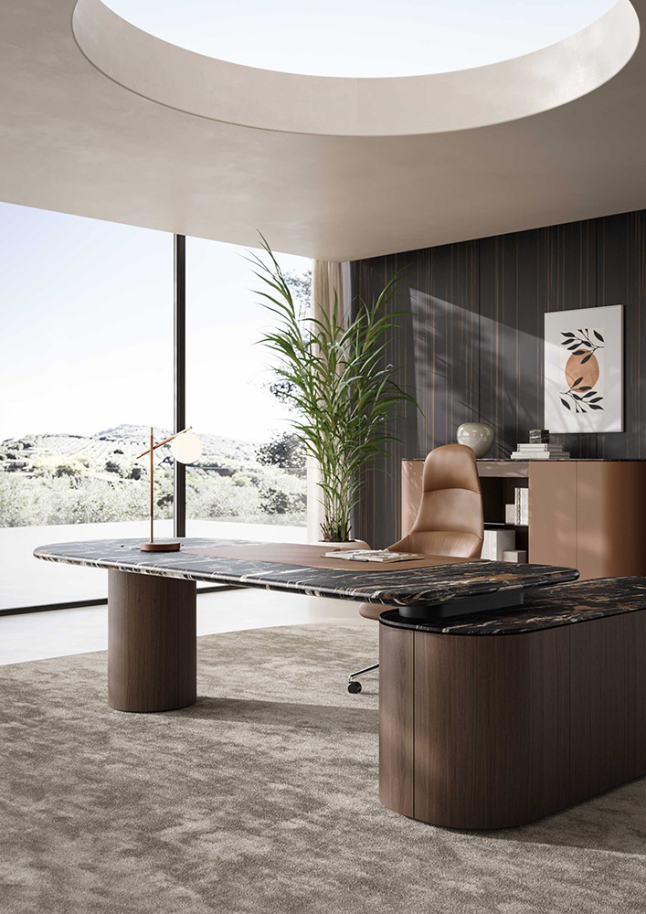 Polished marble delivers maximum visual definition. Veining appears sharper, tones gain depth, and the surface reflects both natural, and artificial light with precision. This quality reinforces the presence of the Executive Desk as a focal element within a luxury office.