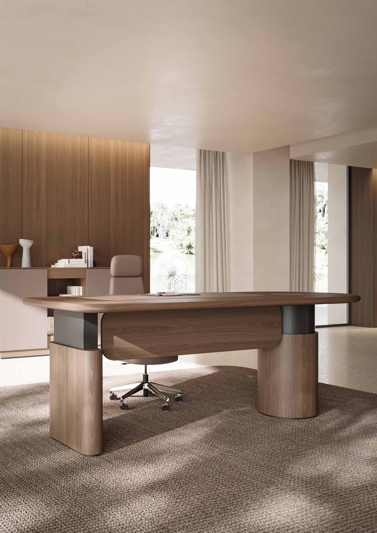 The integrated adjustment technology allows a seamless transition from sitting to standing, enhancing ergonomics, comfort, and well-being without compromising the prestige of an authentically executive design.