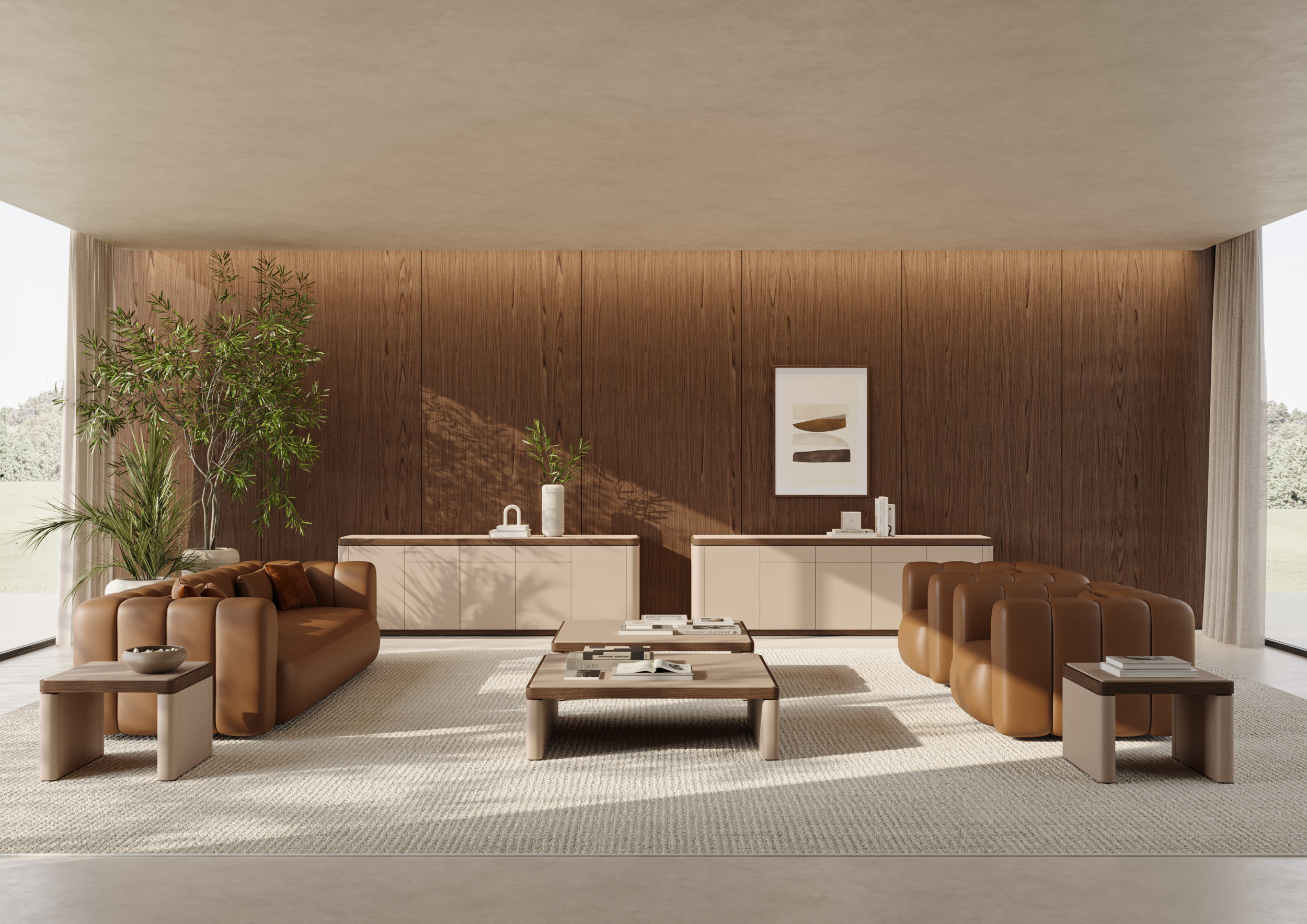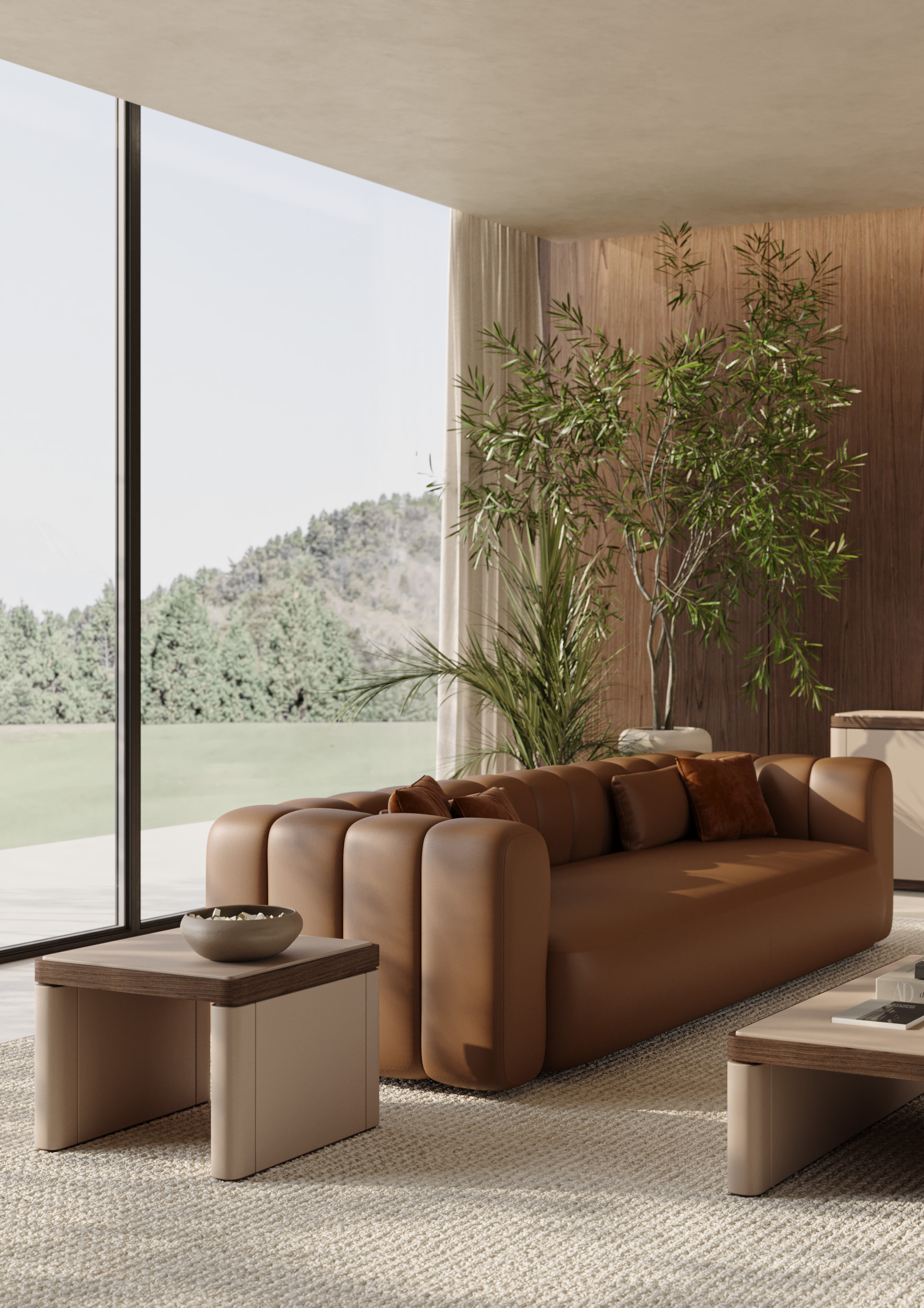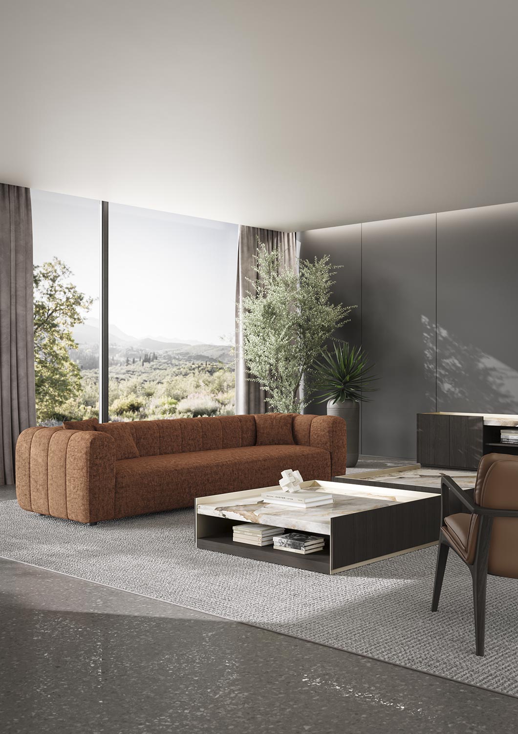 RHEA sofa is available in three sizes – 2200, 2640 and 3080 mm – to adapt flexibly to different settings and requirements. The matching armchair echoes its curved, harmonious style, offering a compact yet extremely comfortable seat.
