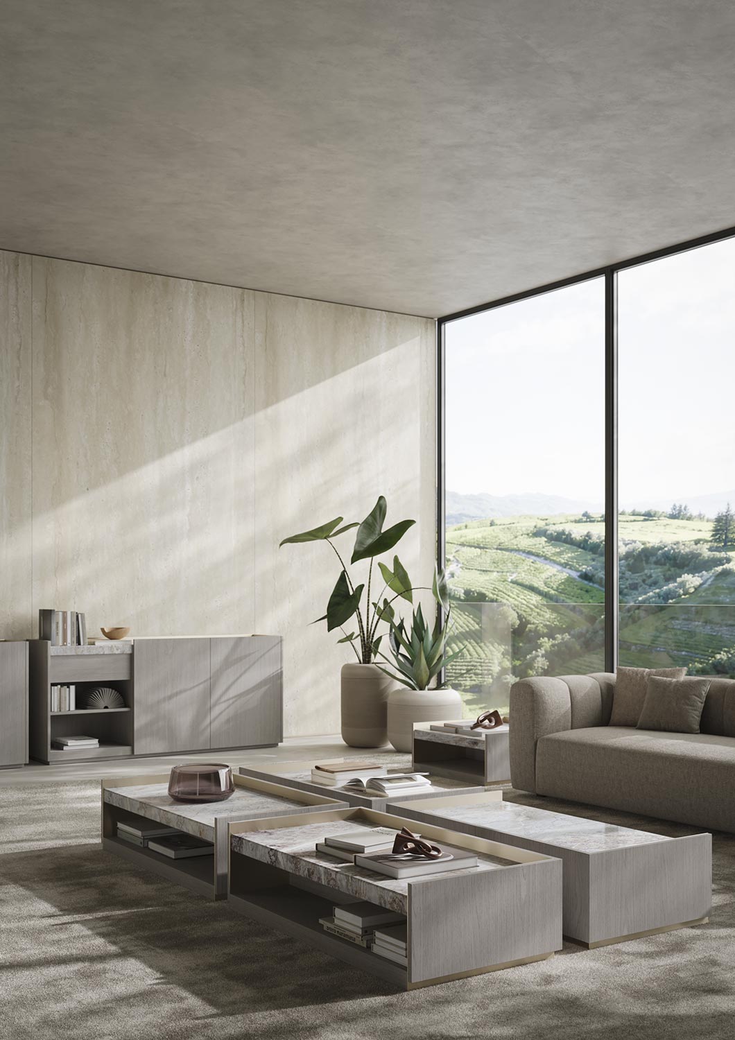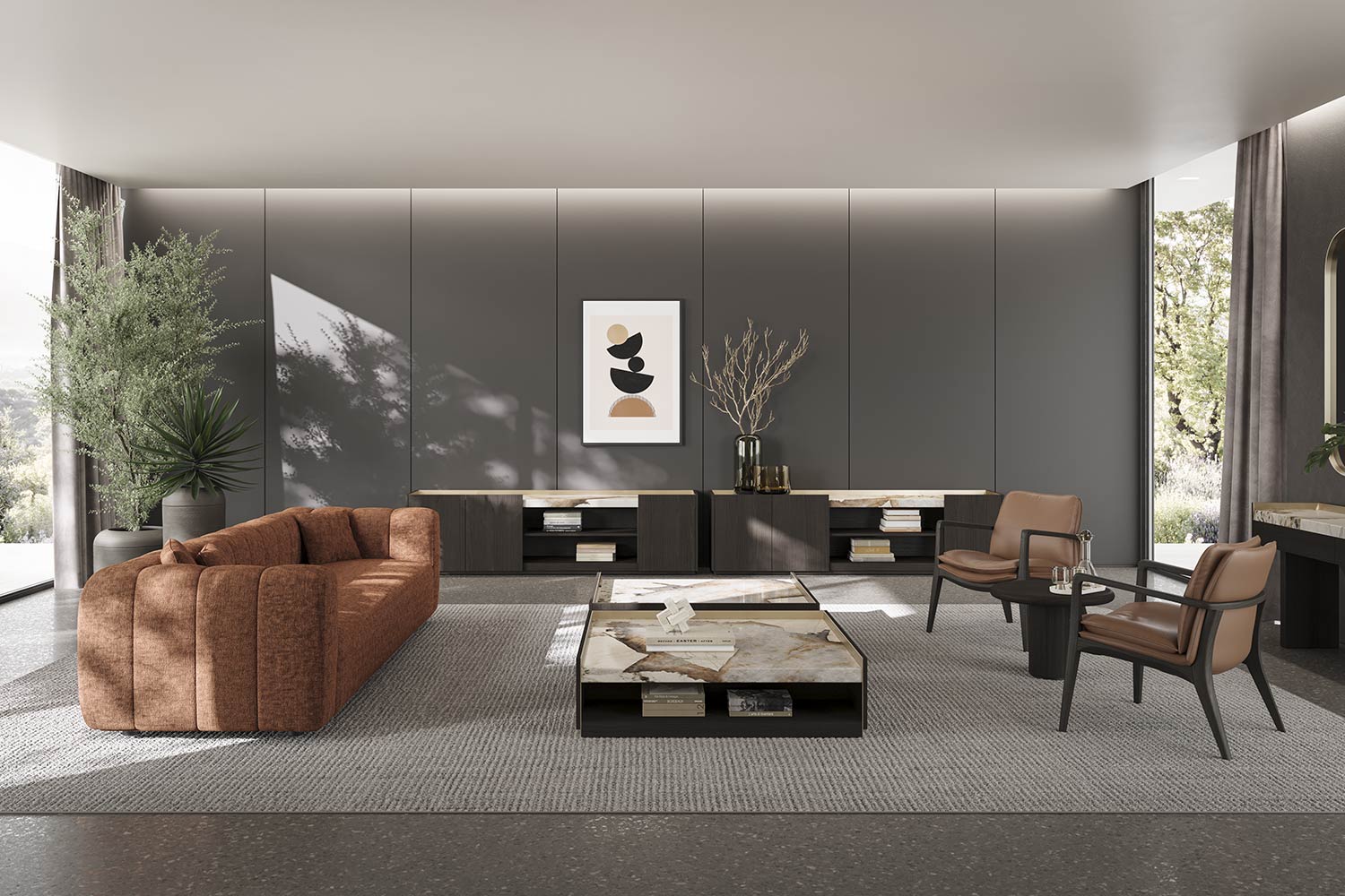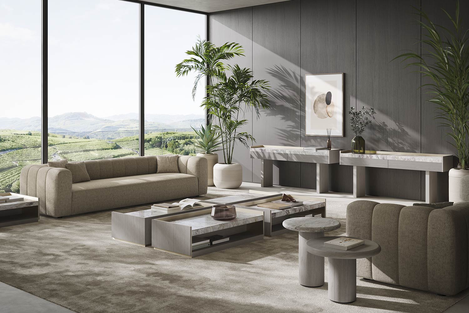 RHEA sofa is available in three sizes – 2200, 2640 and 3080 mm – to adapt flexibly to different settings and requirements. The matching armchair echoes its curved, harmonious style, offering a compact yet extremely comfortable seat.