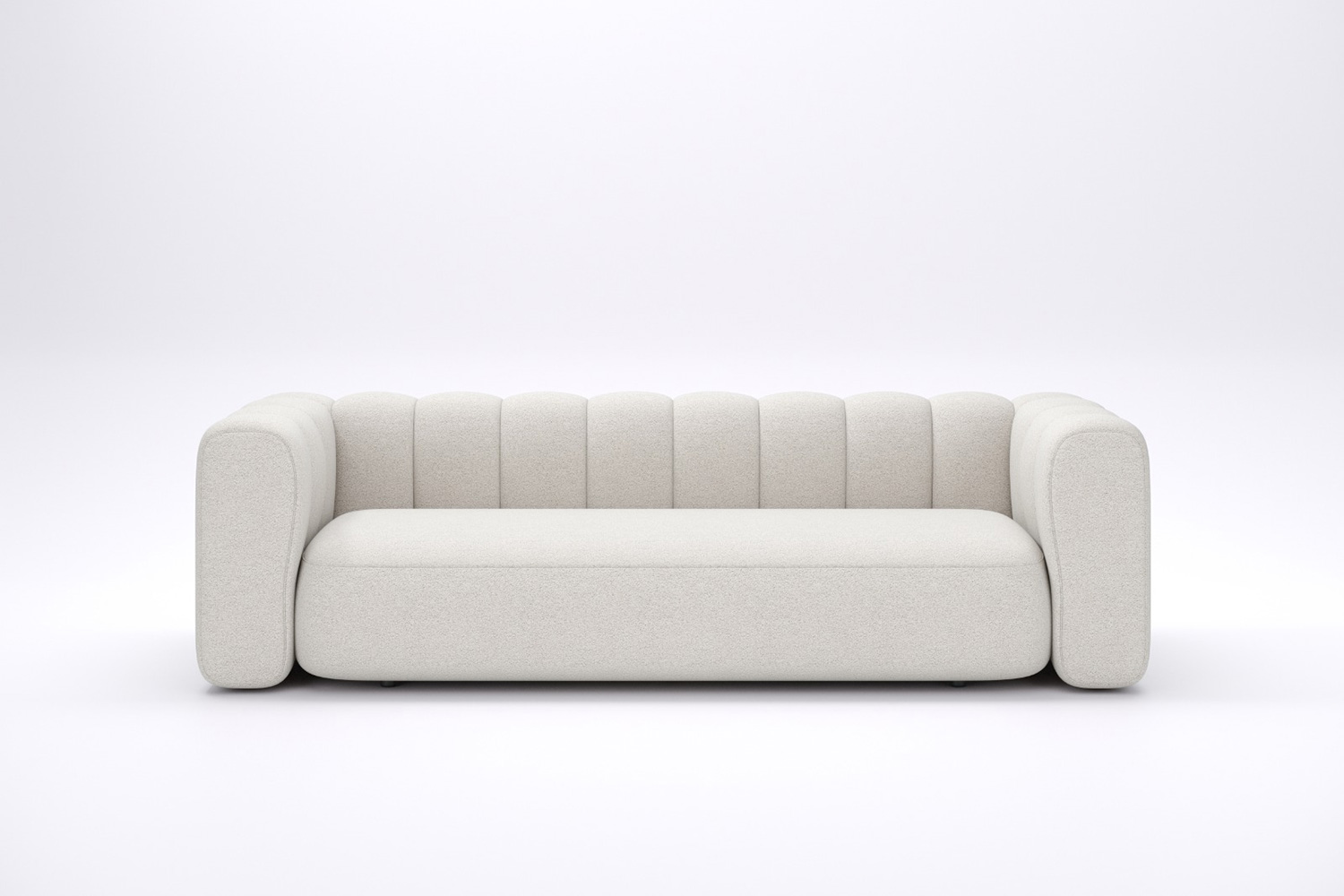 A sofa characterised by vertical lines that define the backrest and armrests, emphasising the three-dimensionality of the design.