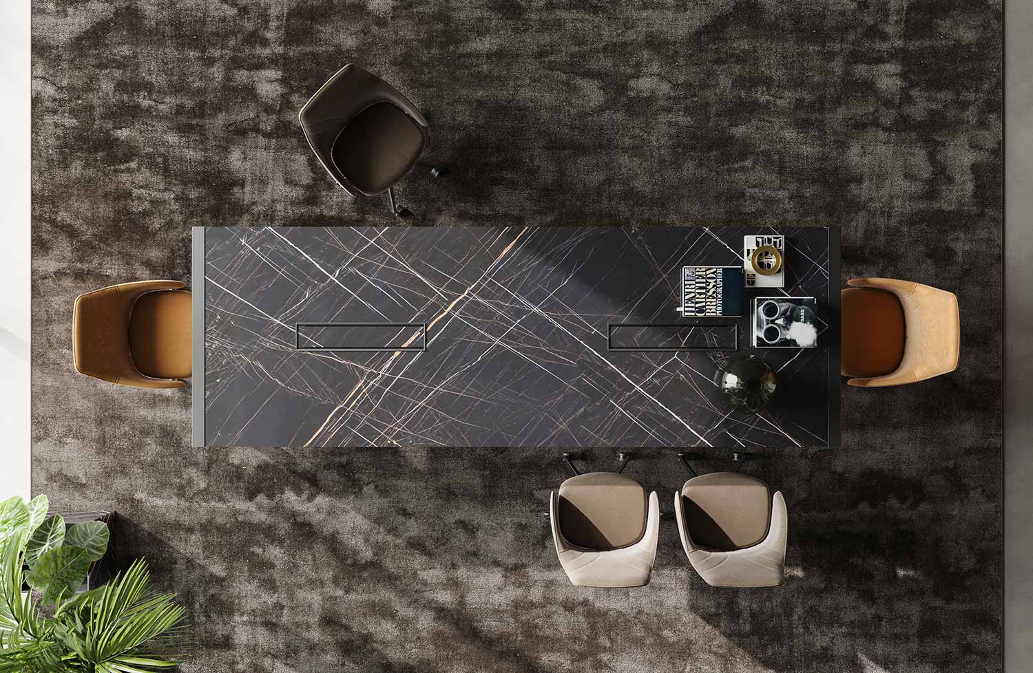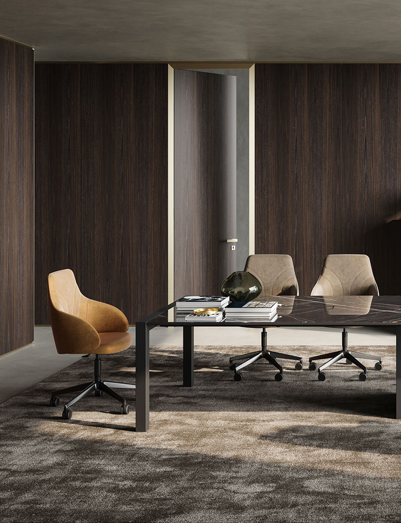 The quality of a table is not measured only by its structure, but also by the visual and tactile impact it offers. Far from being limited to a single style, the Dieci, Dodici, and Extralight collections provide a rich palette of materials and finishes, allowing users to personalize the atmosphere of the workspace.