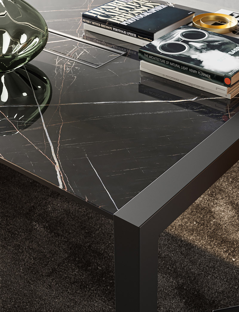 The tabletop can adopt different personalities depending on the needs: Melamine Wood offers maximum practicality for intense daily use, while Lacquered Glass—available in glossy, anti-touch, or with elegant marble effects—adds a touch of modern refinement. For those seeking warmth without sacrificing modernity, there are finishes in Fenix NTM® or sophisticated Veneered Wood.