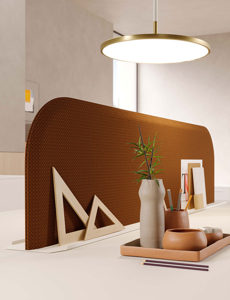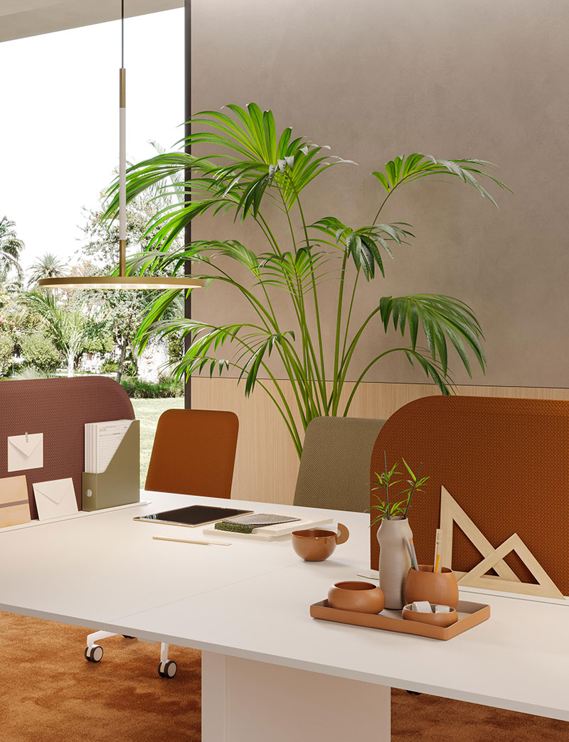 This transition is made possible and immediate by the addition of fabric dividing elements (screens). When the tables are intended to serve as desks, these panels create the necessary division, offering essential visual and acoustic privacy for focus work in open environments. The choice of a light, minimal tabletop, supported by an essential frame, allows the tables to integrate perfectly into diverse organizational cultures, ensuring that the space is always optimized for collaboration or individual concentration, depending on the needs.