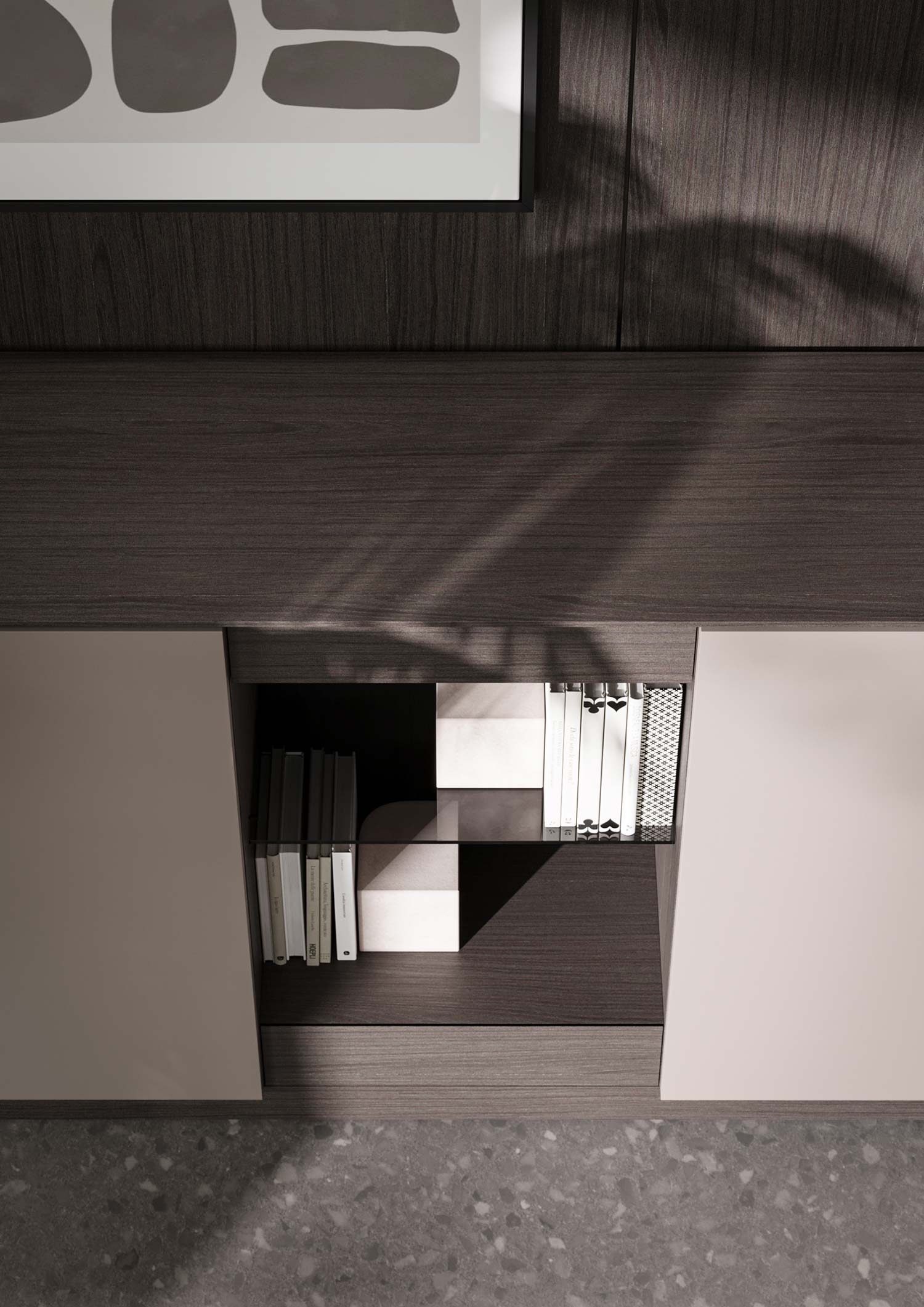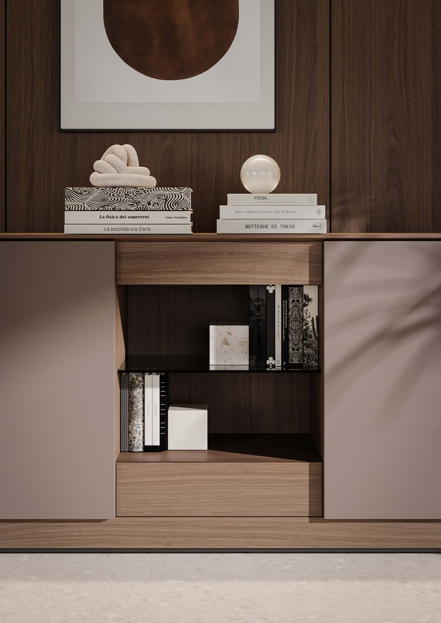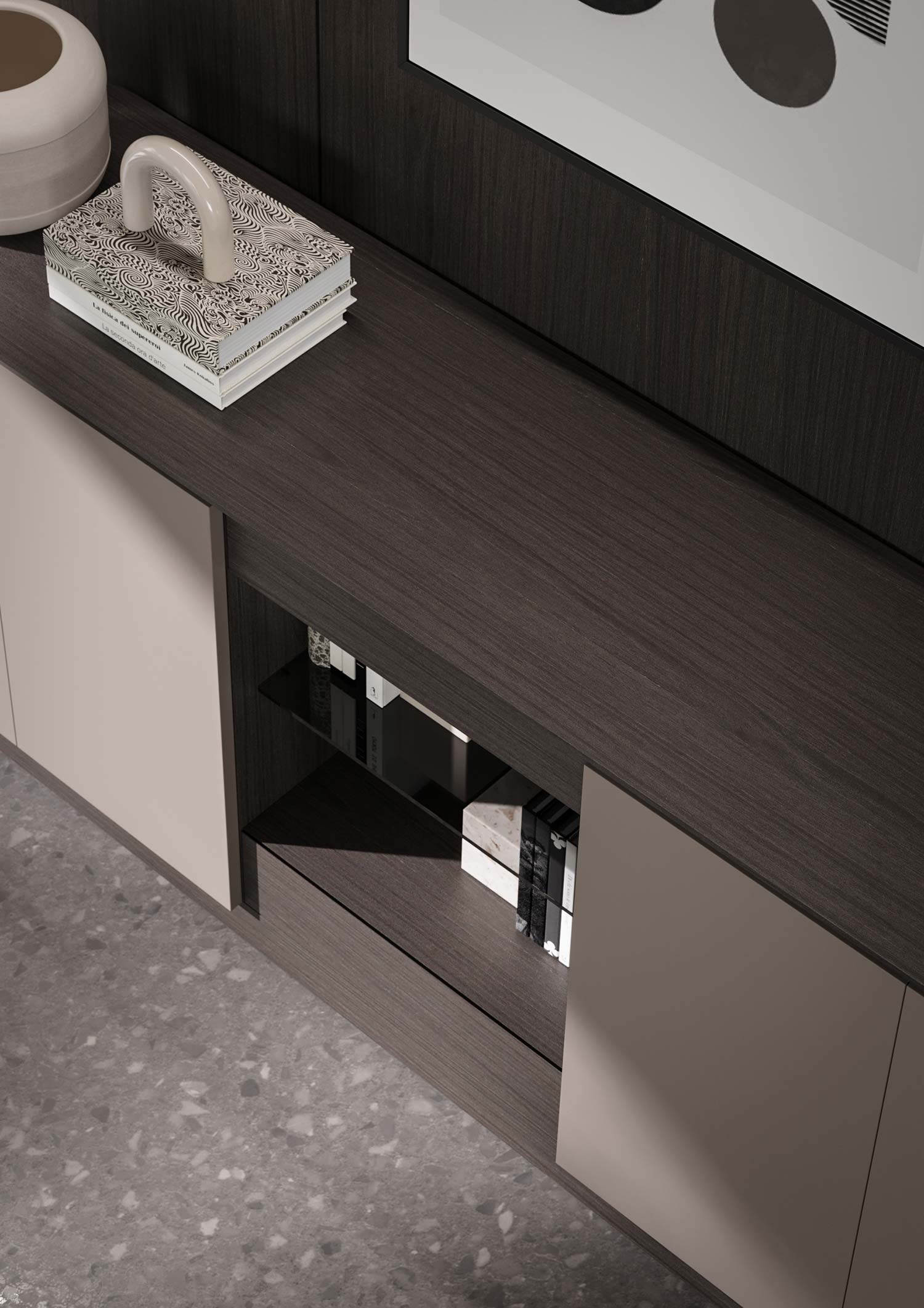 Le BUFFET se compose d’un compartiment ouvert, de deux tiroirs et de portes à ouverture par pression, qui donnent accès aux étagères intérieures. Disponible en deux hauteurs et deux largeurs.