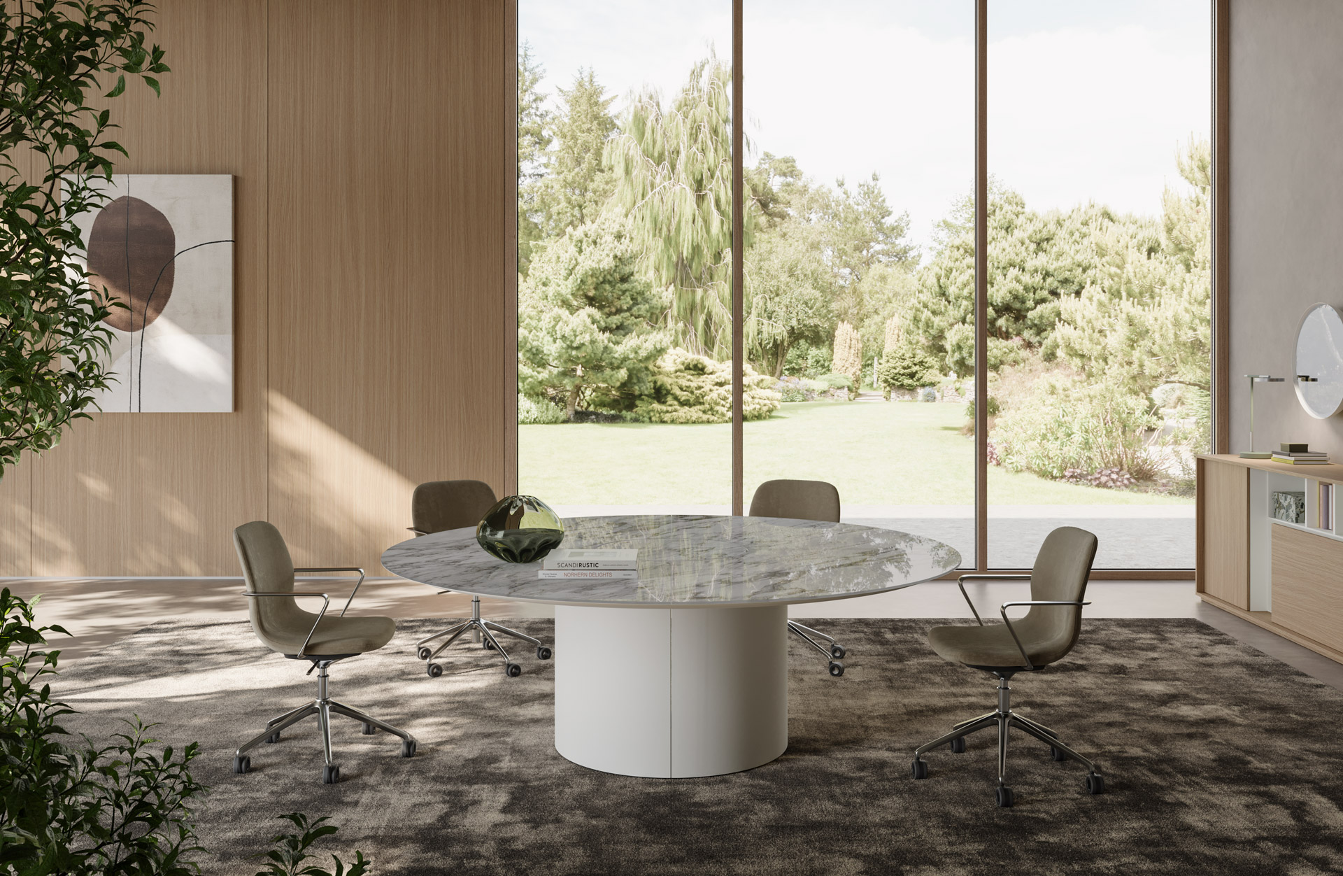 De grandes dimensions pour la table de réunion Round, enrichie de matériaux de haute qualité et de solutions fonctionnelles avancées.