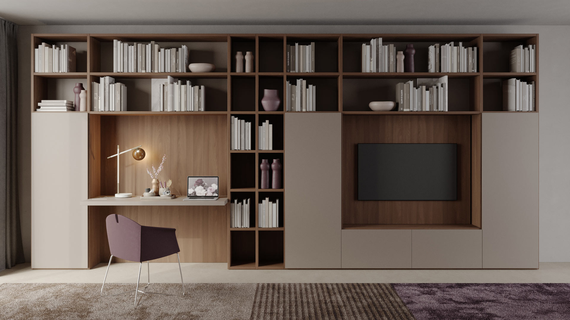 La nostra libreria permette di organizzare libri, oggetti decorativi, posizionare il televisore, integrando un piano scrivania dalle linee essenziali. In questo modo, lo spazio rimane ordinato e il lavoro da casa si trasforma in un’esperienza piacevole e discreta.