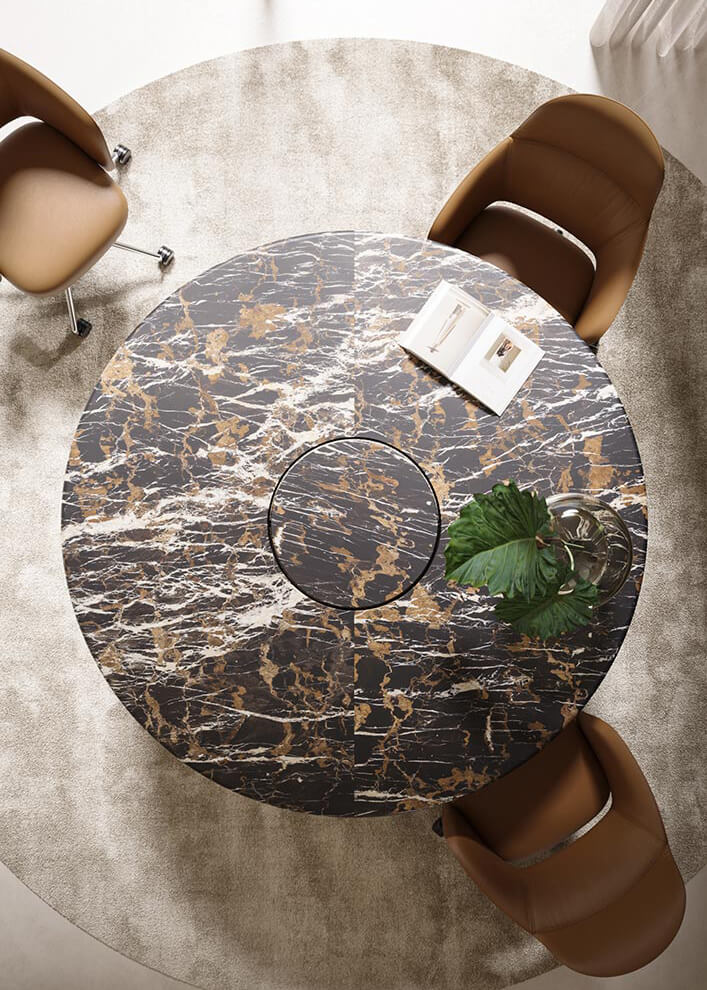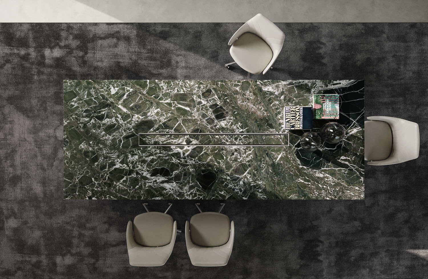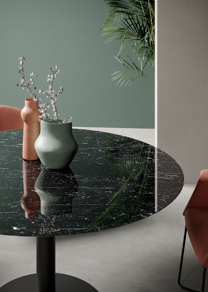 I marmi scuri evocano forza, autorevolezza e raffinatezza. Sono particolarmente indicati per ambienti direzionali e sale riunioni di prestigio.
