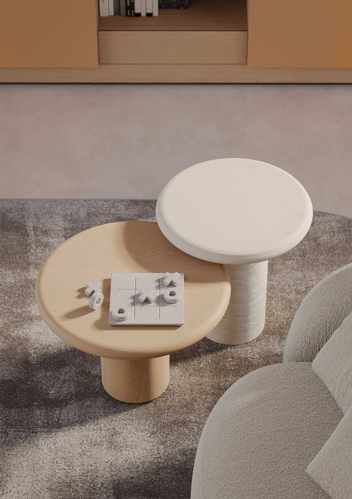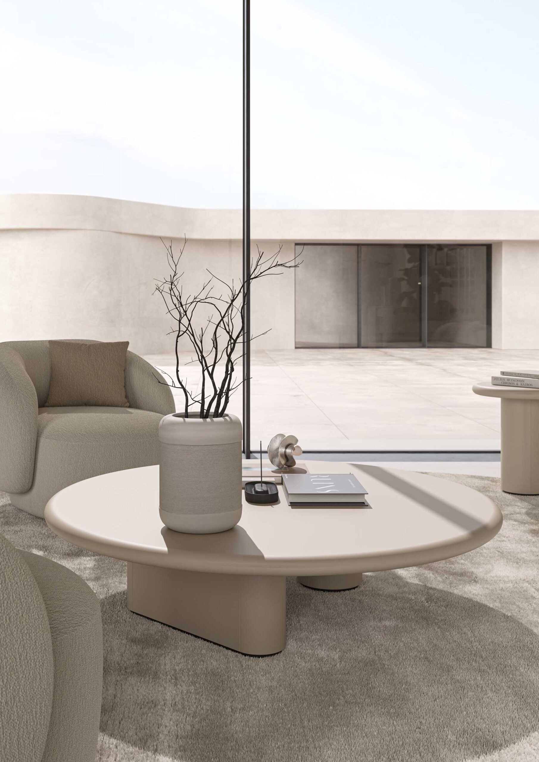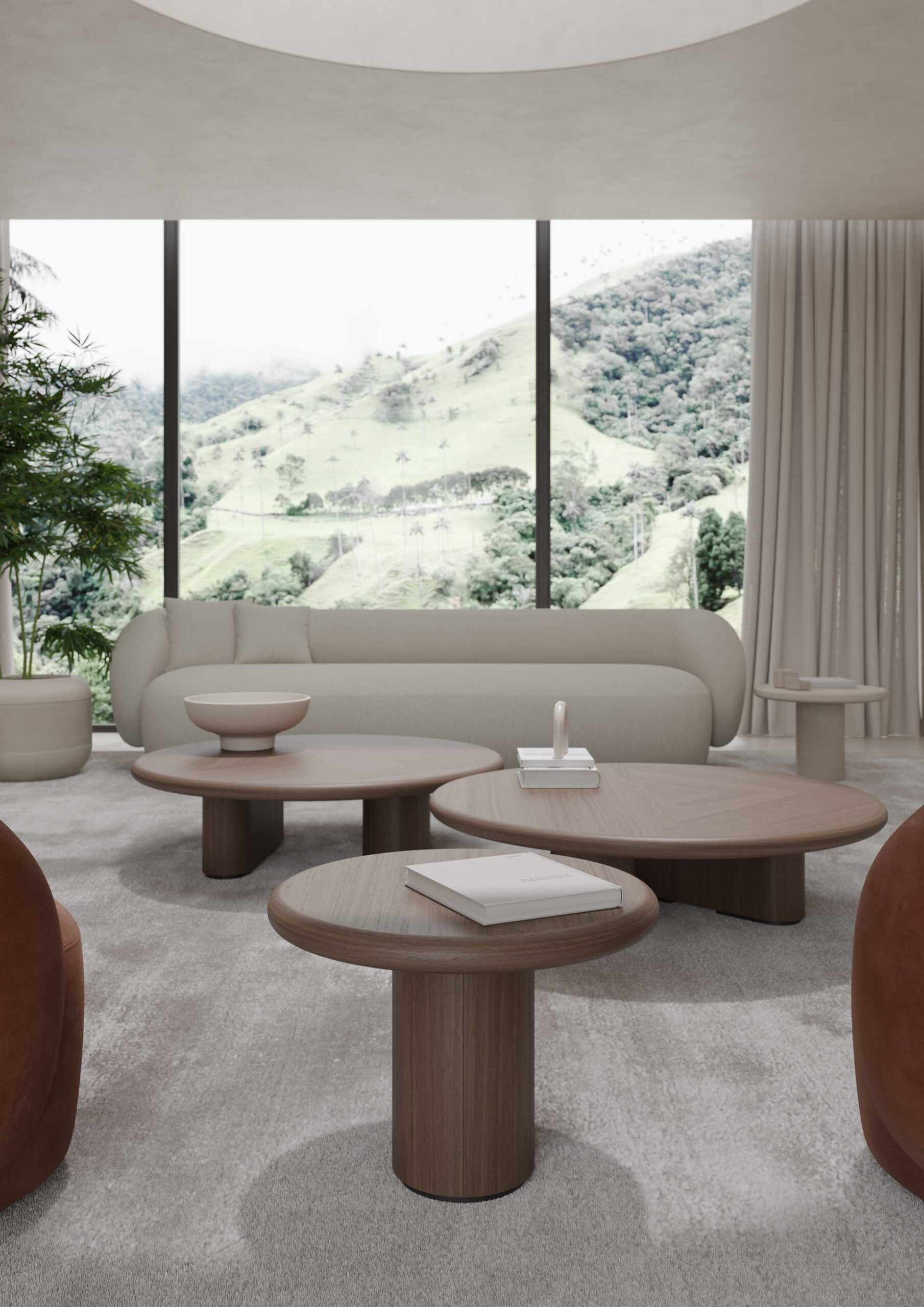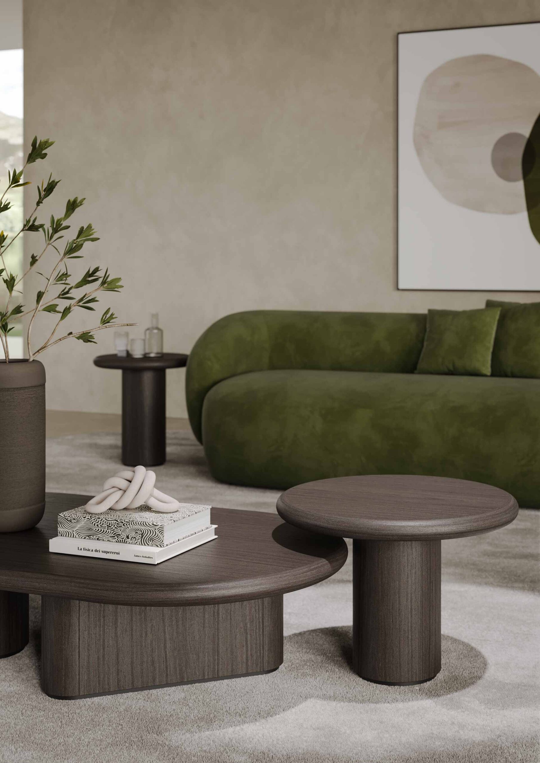 Una collezione di tavoli caffè dalle linee essenziali e forme sinuose.
