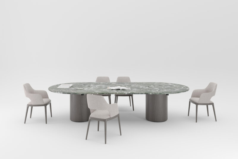 ricercate dialogano con la straordinaria matericità del marmo, donando eleganza e prestigio a ogni ambiente direzionale.
