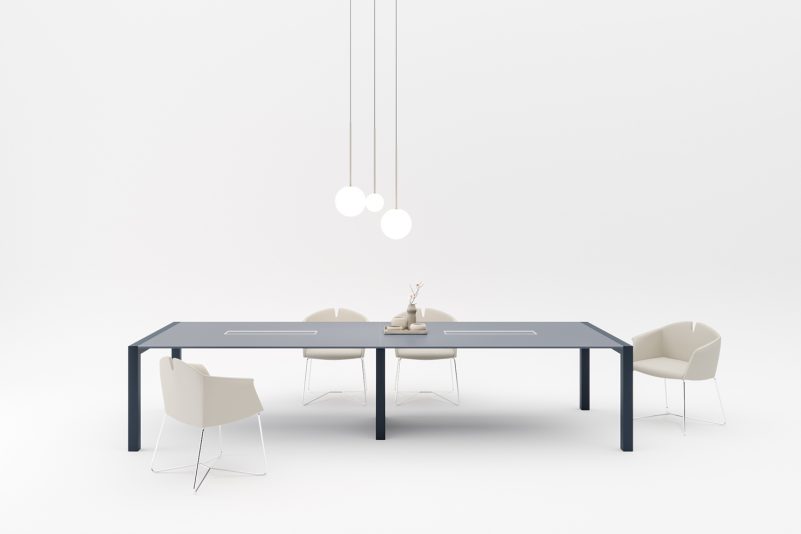 Ricca è la proposta di materiali e finiture, con tonalità coordinate su tutte le superfici. È infatti possibile scegliere una tinta unica per piano e struttura o un mix di colori in perfetto accostamento cromatico. Il piano può essere in legno melaminico, laccato, vetro laccato anti touch, brillante ed effetto marmo, Fenix e legno impiallacciato. La struttura è verniciata opaca in tutta la gamma di colori a catalogo. La scrivania viene proposta con o senza gonna in versione semplice, con piano dattilo, su modular unit e su sliding unit.